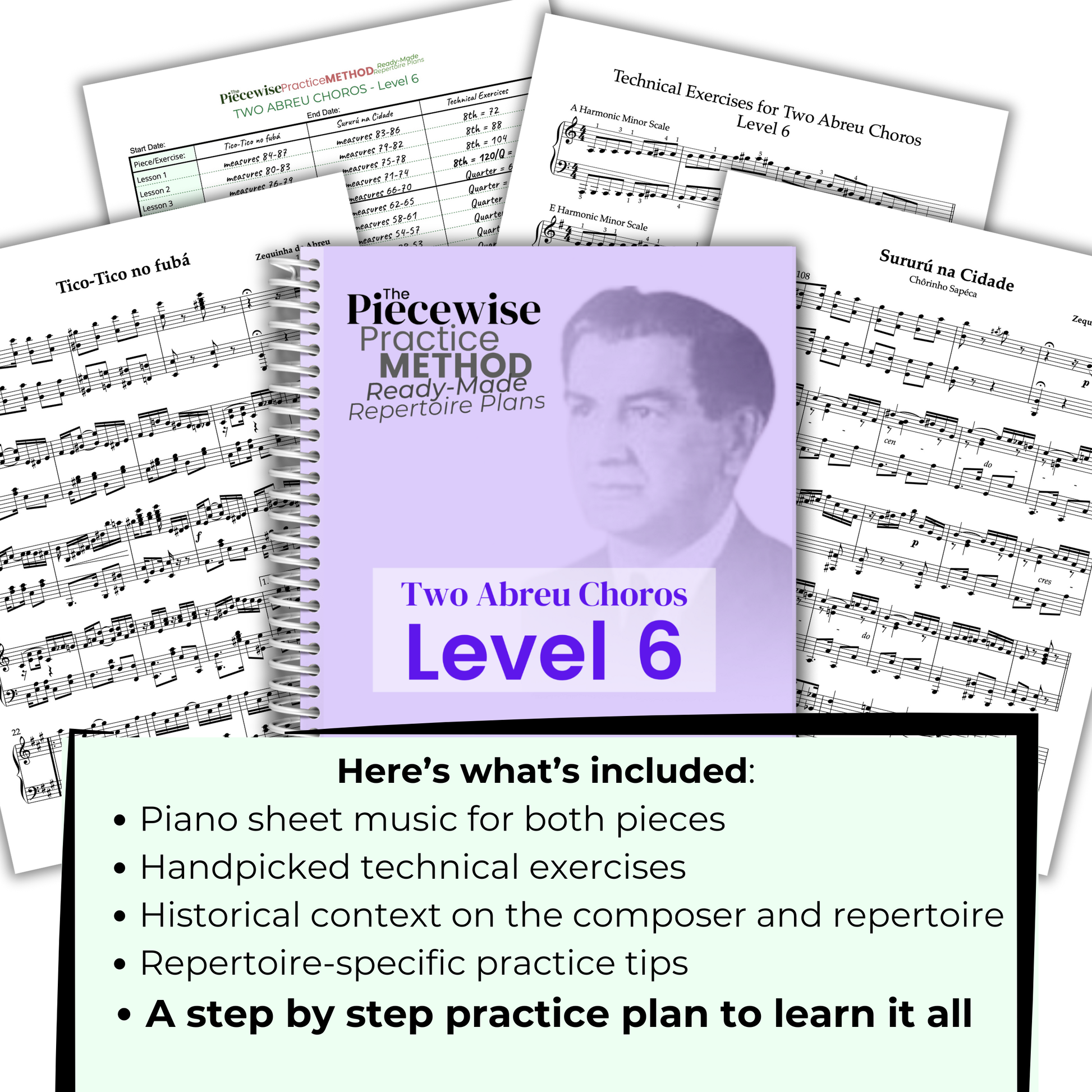 A 30-day, done-for-you practice plan designed to help you develop rhythmic precision, lightness of touch, and expressive energy. These pieces are like ragtime with a Latin twist! With clear daily assignments, coordinated technical work, and piece-specific tips, you’ll bring these lively Brazilian favorites to life without stress or overwhelm.